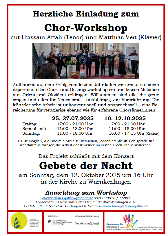 Mitstreiter:innen gesucht! Sie haben Lust zu singen? Dann kommen Sie zum internationalen Projektchor unter der Leitung des syrischen Tenors Hussain Atfah und des Pianisten Matthias Veit ins Bürgerhaus Gottin. Zum ersten Probenblock im Juli 2025 fanden sich 12 Sangesfreudige. Für den zweiten Block vom 10.-12. Oktober gibt es schon 20 Anmeldungen - weitere Stimmen, vor allem auch männliche, sind herzlich Willkommen! Den krönenden Abschluss bietet das gemeinsame Konzert "Gebete der Nacht" mit Melodien aus Orient und Okzident am 12.10.2025 um 16 Uhr in der Kirche zu Warnkenhagen. Die Proben finden im Bürgerhaus Gottin statt. Infos und Anmeldung unter buergerhaus.gottin@freenet.de oder Tel: 039976 - 55885 |