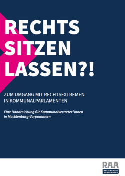 Rechts sitzen lassen?! – Podiumsdiskussion zum Umgang mit Rechtsextremen in Kommunalparlamenten Rechtsextreme Mandatsträger*innen sind in vielen kommunalen Vertretungen Realität. Für demokratische Akteur*innen stellt sich damit eine zentrale Frage: Wie handlungsfähig bleiben – rechtssicher, strategisch und mit klarer Haltung? Die RAA – Demokratie und Bildung Mecklenburg-Vorpommern e. V. stellt ihre neu überarbeitete Handreichung „Rechts sitzen lassen?! Zum Umgang mit Rechtsextremen in Kommunalparlamenten“ vor und lädt zur öffentlichen Podiumsdiskussion ein. Live-Stream kostenfrei über die Ostsee-Zeitung Die Publikation richtet sich an Kommunalvertreter*innen in Mecklenburg-Vorpommern und bietet: - rechtliche Orientierung - strategische Handlungsempfehlungen - Erfahrungsberichte aus kommunaler Praxis - Interviews mit Mandatsträger*innen aus dem ganzen Bundesland Im Zentrum stehen die Perspektiven derjenigen, die im politischen Alltag mit rechtsextremen Akteuren konfrontiert sind. Ziel der Handreichung ist es, Sicherheit im Umgang zu geben und demokratische Handlungsspielräume zu stärken. |