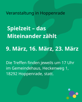 Mit unserer neuen Spielereihe „Spielzeit – das Miteinander zählt“ möchten wir wieder mehr Raum für Begegnung im Dorf schaffen. Gemeinsam erleben wir entspannte Momente, die zugleich zum Nachdenken anregen. Wir knüpfen an die fast vergessene Tradition der Spieleabende an und laden dazu ein, sich vor Ort zu treffen und einen unterhaltsamen Abend miteinander zu verbringen. Freuen Sie sich auf altbekannte und neue Spiele in einer überraschend neuen, gesellschaftlich spannenden Variante. Getränke, Essen und eigene Spiele dürfen gerne mitgebracht werden; eine Anmeldung ist nicht erforderlich. Der Spieleabend richtet sich an Personen ab 16 Jahren. Wann: 09.03. / 16.03. / 23.03. jeweils von 17-19 Uhr Wo: Gemeindehaus Hoppenrade, Heckenweg 1 Die Teilnahme ist kostenfrei. |