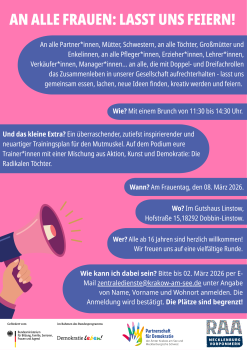 08. März 2026 - Wir feiern den Internationalen Frauentag! Seit 1911 gibt es ihn schon, den Frauentag. Seit 1921 findet er am 08. März statt und seit 1975 ist er international. Ging es in den ersten Jahren noch um das Frauenwahlrecht, rückten später auch Arbeitsbedingungen, Gleichberechtigung und Gender Pay Gap - also die unterschiedliche Entlohnung von Frauen und Männern für gleiche Arbeit - in den Mittelpunkt der Forderungen der Frauen. Das Motto des Internationalen Frauentags 2026 "Geben, um zu gewinnen", betont die Kraft der Gegenseitigkeit und Unterstützung. In diesem Sinne laden wir am 08.03.2026 von 11:30 - 14:30 Uhr zu einem gemeinsamen Frauentagsbrunch ins Gutshaus Linstow. Die Teilnahme ist kostenfrei. Alle weiteren Informationen finden Sie hier. Bitte bis zum 02.03.2026 per Mail an zentraledienste@krakow-am-see.de anmelden. |