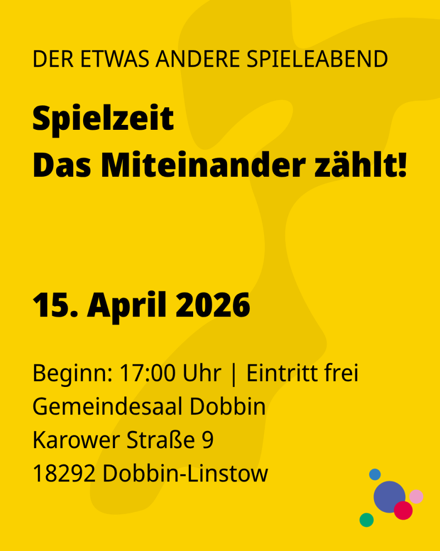 Dieser Spielabend wird anders! Erleben Sie altbekannte Spiele mal auf eine andere, gesellschaftlich spannende Art und lassen Sie sich überraschen. Dieses Mal kreist alles um "Werte" - mehr verraten wir noch nicht. Aber: wir zocken, bis sich die Balken biegen. Und fragen uns gleichzeitig, in welcher Welt wollen wir eigentlich leben? Kommen Sie um 17 Uhr zur Werteauktion in den Gemeindesaal Dobbin! nächste Termine Dobbin-Linstow: