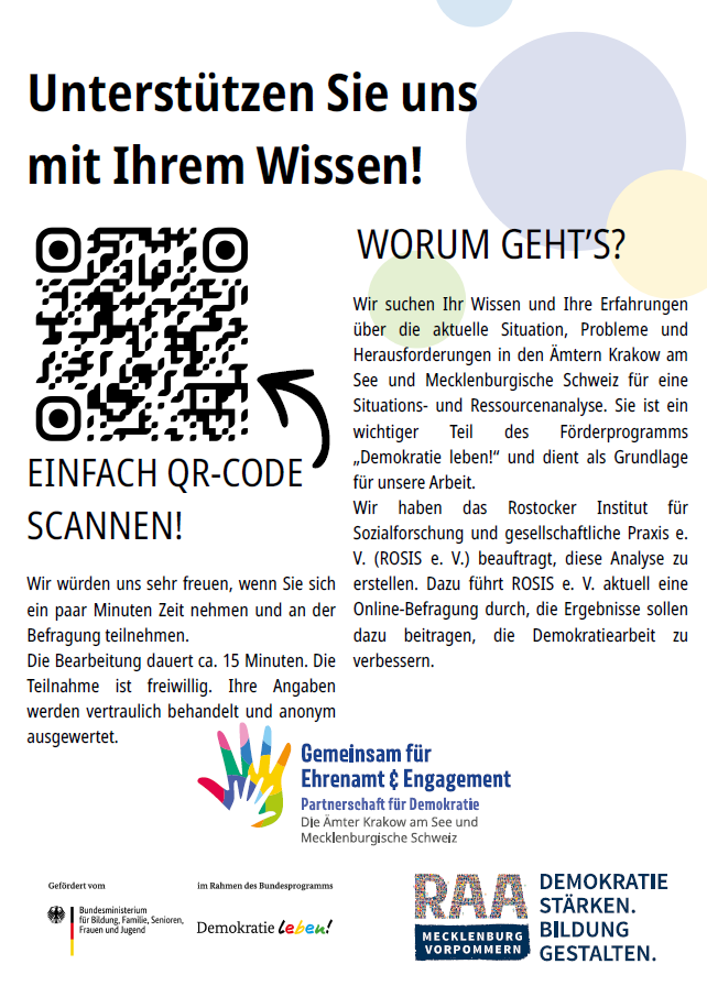 Für Engagierte Herzliche Einladung zum V. Fördermitteltag im Landkreis Rostock. Am 11. April 2026 informieren wir Vereine und ehrenamtlich Engagierte über verschiedene Fördermöglichkeiten. Wann: von 10 - 14 Uhr Wo: Das Studio 2 Glasewitzer Chaussee 18, 18273 Güstrow weitere Infos demnächst hier |